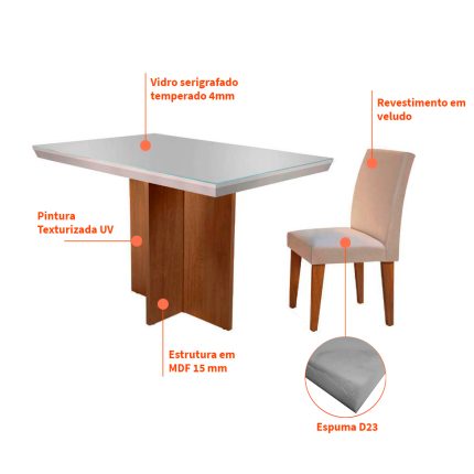 Conjunto de Mesa de Jantar Berlim II com Tampo de Vidro Off White e 4 Cadeiras Grécia Veludo Creme