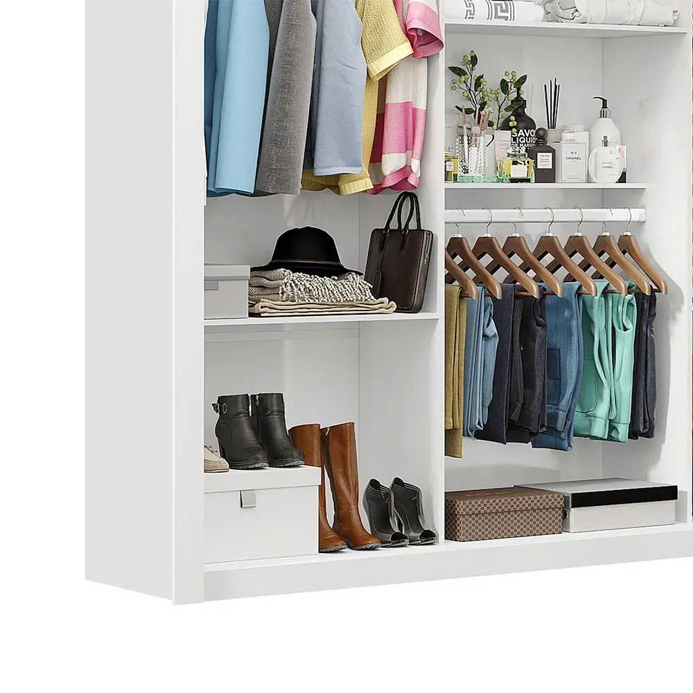 Os cabideiros, além de resistentes, não envergam com o peso dos moletons, ternos, sobretudos, camisas e acessórios. Prateleiras são ideias para colocar roupas de cama e de banho, perfumes, kits de maquiagem, caixinhas com acessórios e bolsas menores. As quatro gavetas fixadas sobre corrediças metálicas, são ótimas para guardar blusas dobradas, shorts, malhas e roupas íntimas.